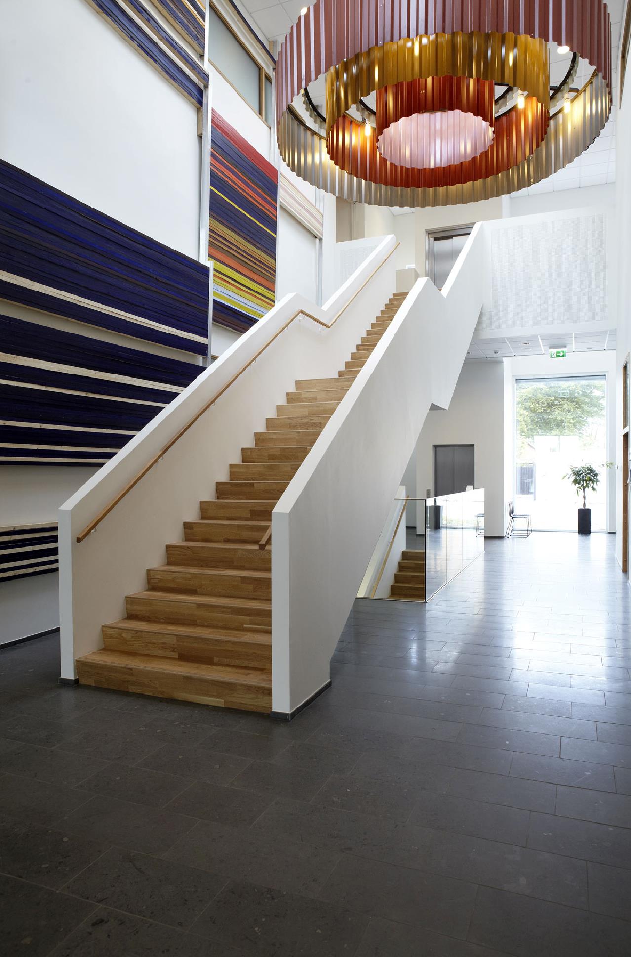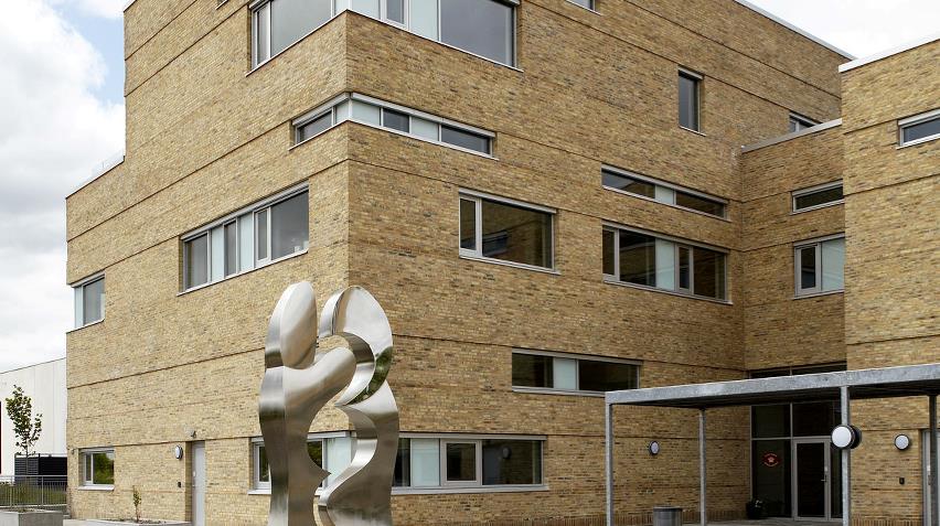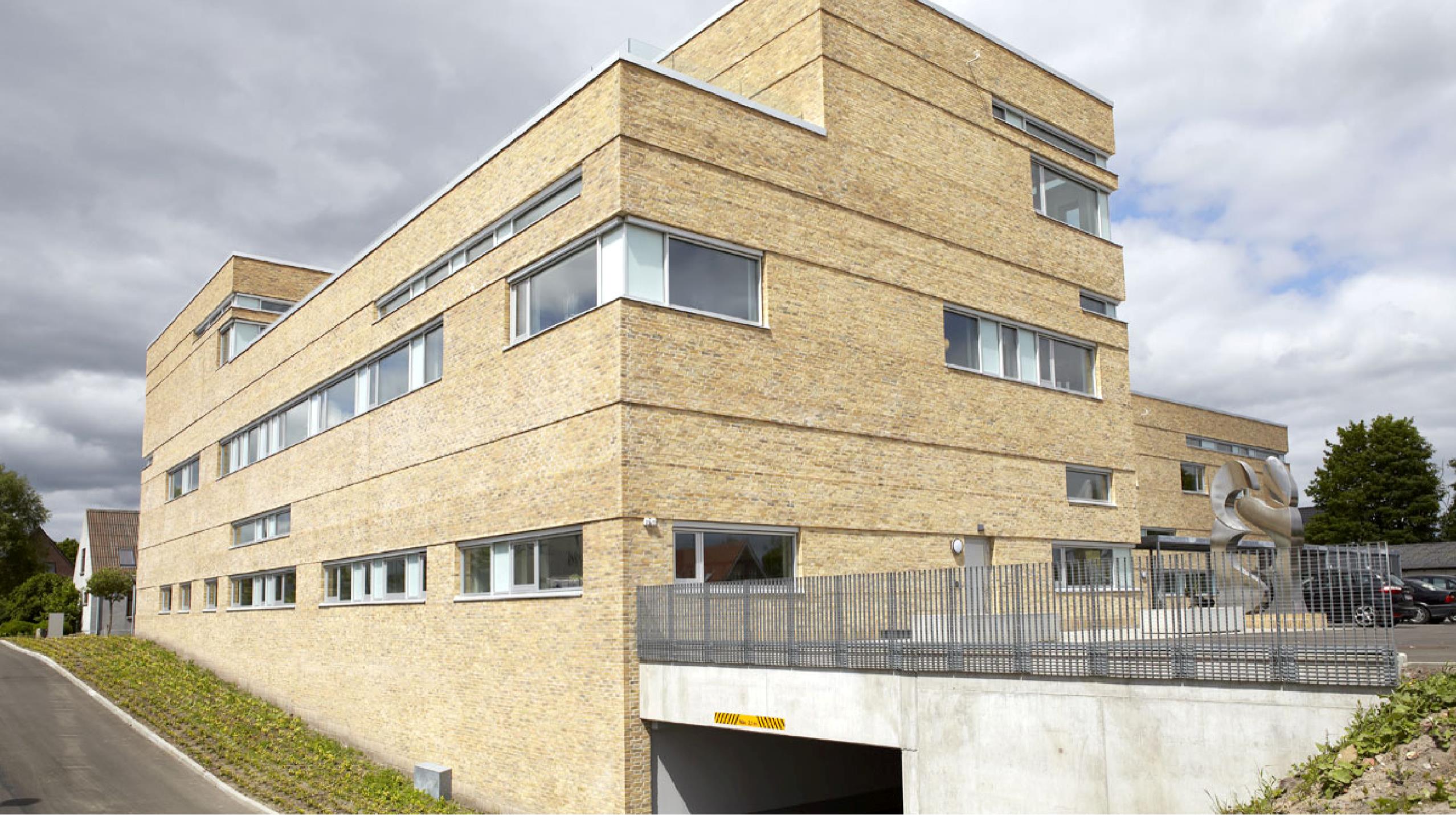 Til facaderne bruges en håndstrøgen sandfarvet tegl – et klassisk dansk byggemateriale, der netop gennem sin almindelighed udtrykker demokrati og nærhed til borgeren, men her raffineret for at give den aura af kvalitet, der er med til at skabe den venlige værdighed, der ønskes.