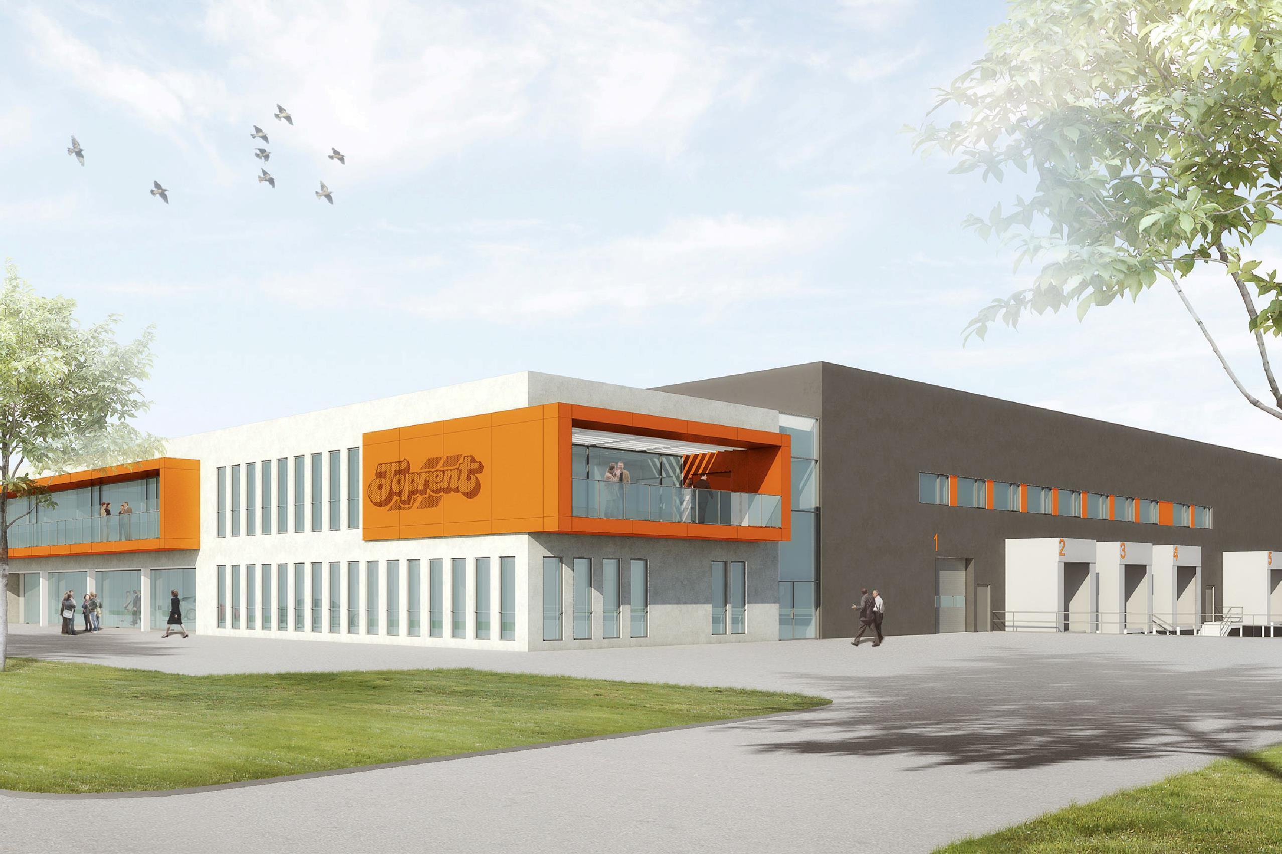 Tri-Consult A/S opfører i samarbejde med Toprent A/S, Atrio Arkitekter og Base Erhverv A/S nyt kontor på 1950 m2 med tilhørende 7500 m2 produktlager.