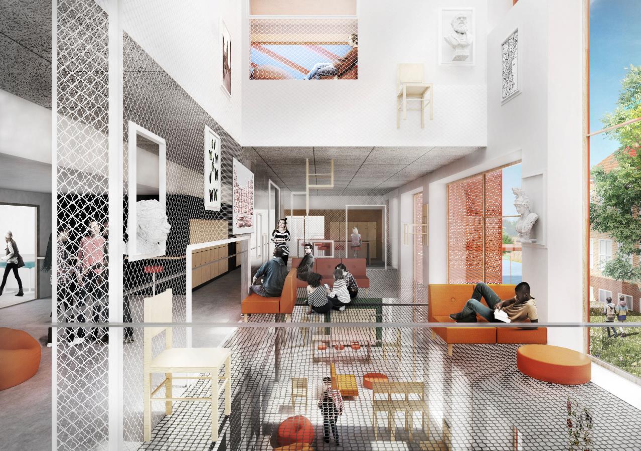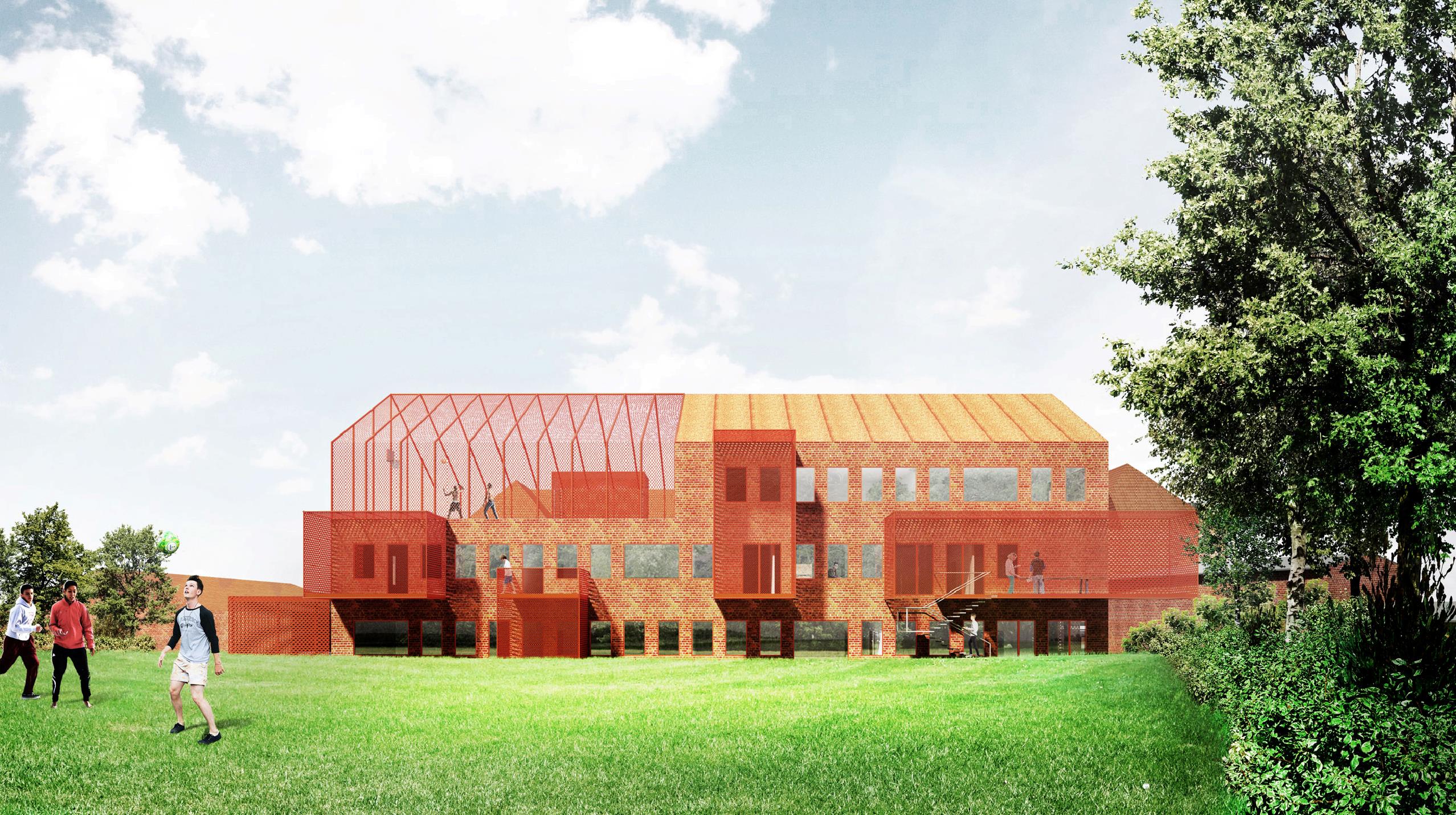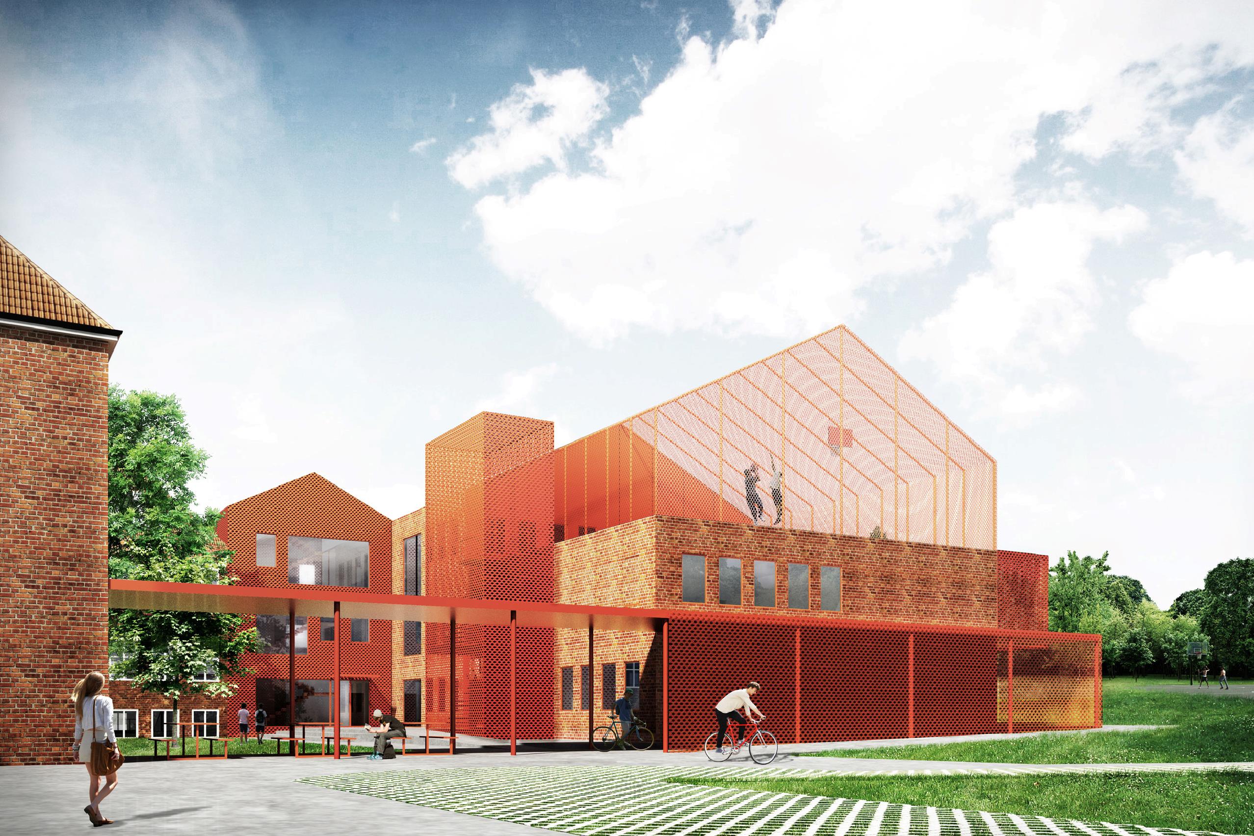 Vinderforslaget fortolker de eksisterende skolebygninger fra starten af 1900-tallet i en ny bygning med rødt tag og hvor teglfacadens solide og klassiske karakter modsvares i røde karnapper i metaltrådnet. De foreslåede karnapper kobler sig på facaden som lette konstruktioner i forskellige formater og kan integreres som en del af skolens øverste etage i form af en udendørs boldbane.